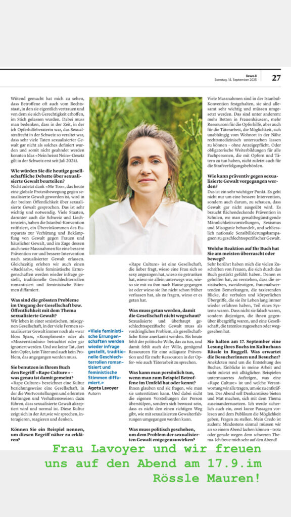 Mit Beiträgen von: Lilly Wilhelmi, Sophie Strehlau, Jana Schocher, Hannah Eberle, Gwendolyn Bölke, Chiara Remonato, Juliana Gafner, Giulia Müller, Mina Real, Livia Pfister, Noah Schädler, Franziska Rehak, Raphael Rupp, Romy Beck.